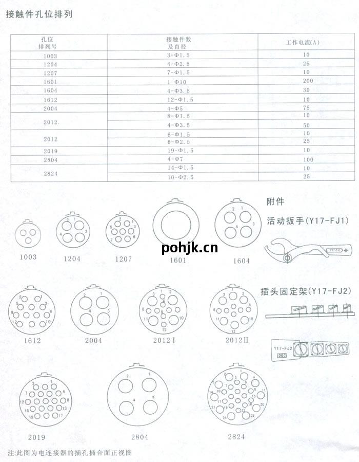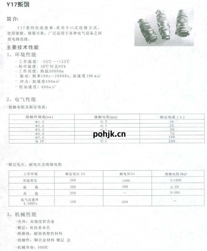 壹(yi)、Y17系列(lie)圓(yuan)形(xing)電(dian)連(lian)接器(qi)(航(hang)空(kong)插頭)簡(jian)介 Y17系列(lie)電(dian)連(lian)接器(qi),采(cai)用(yong)卡(ka)口式連(lian)接方(fang)式,使(shi)用便捷(jie),鎖緊(jin)可(ke)靠,廣泛(fan)適(shi)用(yong)於各(ge)種(zhong)電(dian)氣(qi)設(she)備(bei)之(zhi)間的(de)電(dian)路(lu)連(lian)接。 二、主(zhu)要技(ji)術性(xing)能(neng)1、環(huan)境技(ji)術性(xing)能(neng)